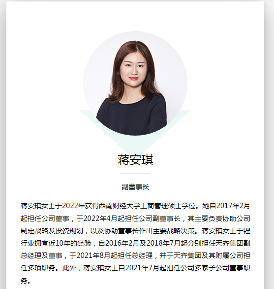 資料顯示,蔣安琪在鋰行業(yè)擁有近10年工作經(jīng)驗,自2016年2月、2018年7月起分別擔(dān)任天齊集團(tuán)副總經(jīng)理、董事,并于2021年8月至2023年6月?lián)翁忑R集團(tuán)總經(jīng)理,她同時在天齊集團(tuán)及其附屬公司擔(dān)任多項職務(wù)。此外,蔣安琪自2021年7月起擔(dān)任天齊鋰業(yè)多家子公司董事職務(wù)。