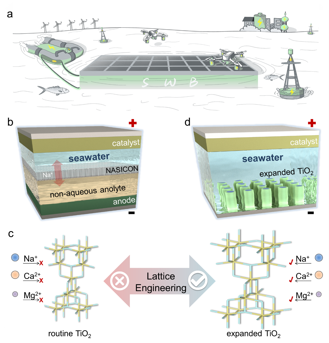 (c)常規(guī)和晶格膨脹的銳鈦礦TiO2在海水中不同陽離子嵌入差別的示意圖;(d)本文構(gòu)筑的開放型可充放電海水電池的結(jié)構(gòu)示意圖。