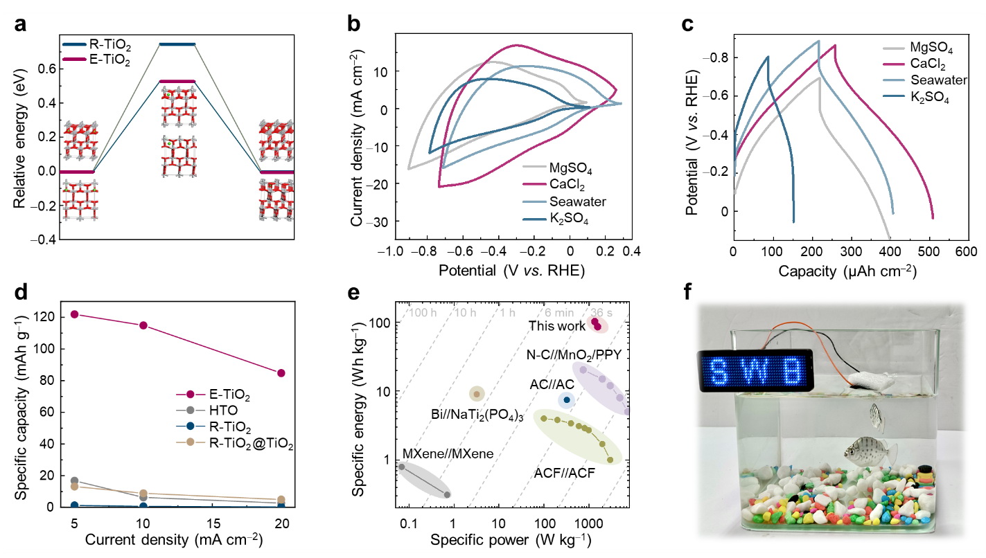要點(diǎn)5:圖5a的DFT計算表明,E-TiO2同樣可以降低其他陽離子的擴(kuò)散勢壘(例如Ca2+)。通過CV和GCD(圖5b,c)可知,E-TiO2在其他電解液中也具有類似于儲鈉時的贗電容主導(dǎo)特性。當(dāng)電流密度為10mA/cm2時,E-TiO2儲存Ca2+和Mg2+的面容量分別為247和182 μAh/cm2,接近Na+的容量(259 μAh/cm2)。直接使用天然海水作為電解液,構(gòu)建了以E-TiO2為負(fù)極材料,電催化劑為正極的海水二次電池。在5 mA/cm2的電流密度下,E-TiO2的比容量為152 mAh/g(圖5d)?;谡?fù)極活性物質(zhì)的質(zhì)量,新型海水電池的比能量/功率密度優(yōu)于當(dāng)前報道的可充放海水儲能器件、水系鈉鉀及鎂鈣離子電池(圖5e)。團(tuán)隊對二次海水電池的原型也進(jìn)行了展示(圖5f)。
