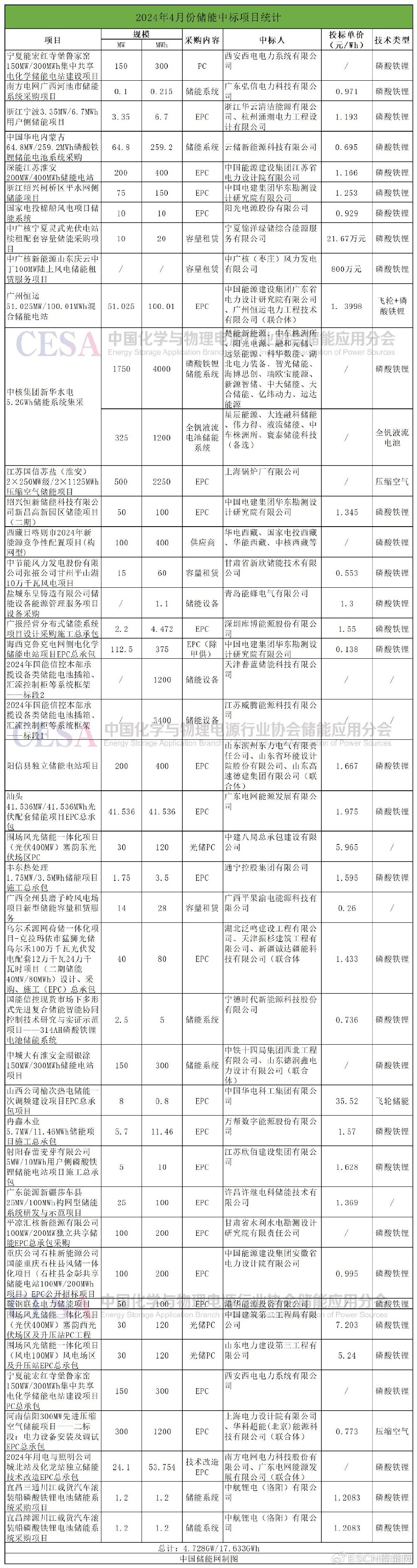 據(jù)中國儲能網(wǎng)不完全統(tǒng)計,4月份共有32.359GWh儲能招標項目開標,容量規(guī)模是上個月的2.1倍,其中完成招標的項目規(guī)模共4.728GW/17.633GWh,另外,有14.726GWh 容量規(guī)模的儲能招標項目公布了中標候選人。