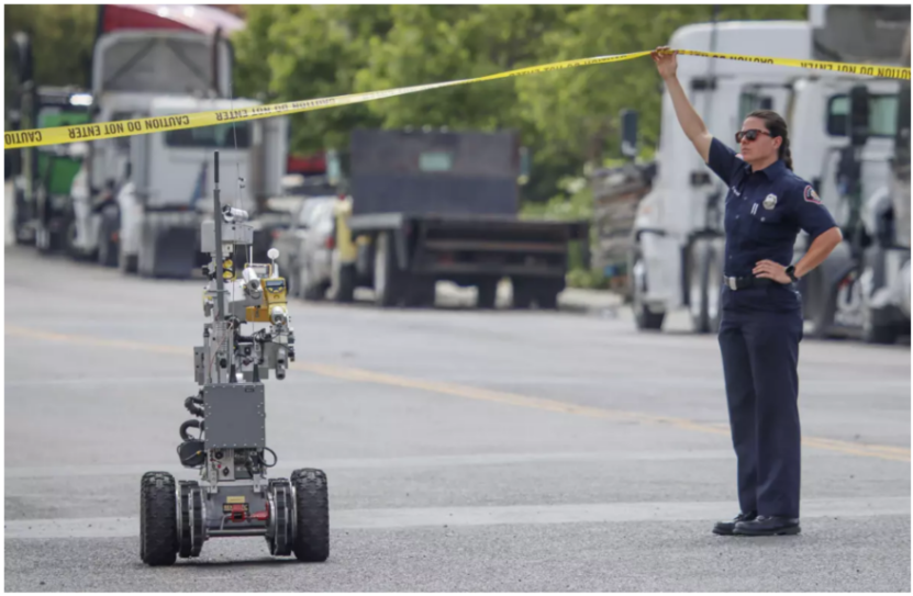 加州消防官員舉起警戒線,允許機(jī)器人進(jìn)入設(shè)施。(攝影:Sandy Huffaker,為《圣地亞哥聯(lián)合論壇報》提供)