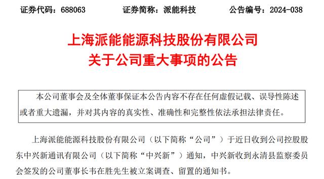 5月19日晚間,國(guó)內(nèi)知名企業(yè)儲(chǔ)能企業(yè)上海派能科技股份有限公司(以下簡(jiǎn)稱“派能科技”)公告稱,公司近日收到其控股股東中興新通訊有限公司(下稱“中興新”)通知,中興新收到永清縣監(jiān)察委員會(huì)簽發(fā)的公司董事長(zhǎng)韋在勝先生被立案調(diào)查、留置的通知書。