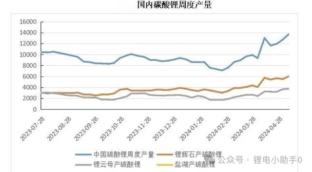 4月國(guó)內(nèi)主要正極材料產(chǎn)量均有增長(zhǎng),其中用量最大的磷酸鐵鋰正極材料產(chǎn)量環(huán)比增長(zhǎng)28%,錳酸鋰產(chǎn)量環(huán)比增長(zhǎng)63.8%,鈷酸鋰產(chǎn)量環(huán)比增長(zhǎng)12%,帶動(dòng)國(guó)內(nèi)碳酸鋰需求增長(zhǎng)。