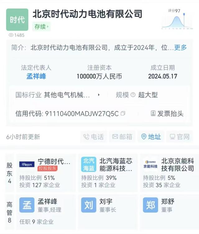 《中國經(jīng)營報》記者在天眼查上看到,5月17日,北京時代動力電池有限公司成立,法定代表人為孟祥峰,注冊資本10億元人民幣,是一家以從事電氣機械和器材制造業(yè)為主的企業(yè)。股東信息顯示,該公司由寧德時代、小米汽車科技有限公司、北汽海藍(lán)芯能源科技(北京)有限公司、北京京能科技有限公司共同持股。