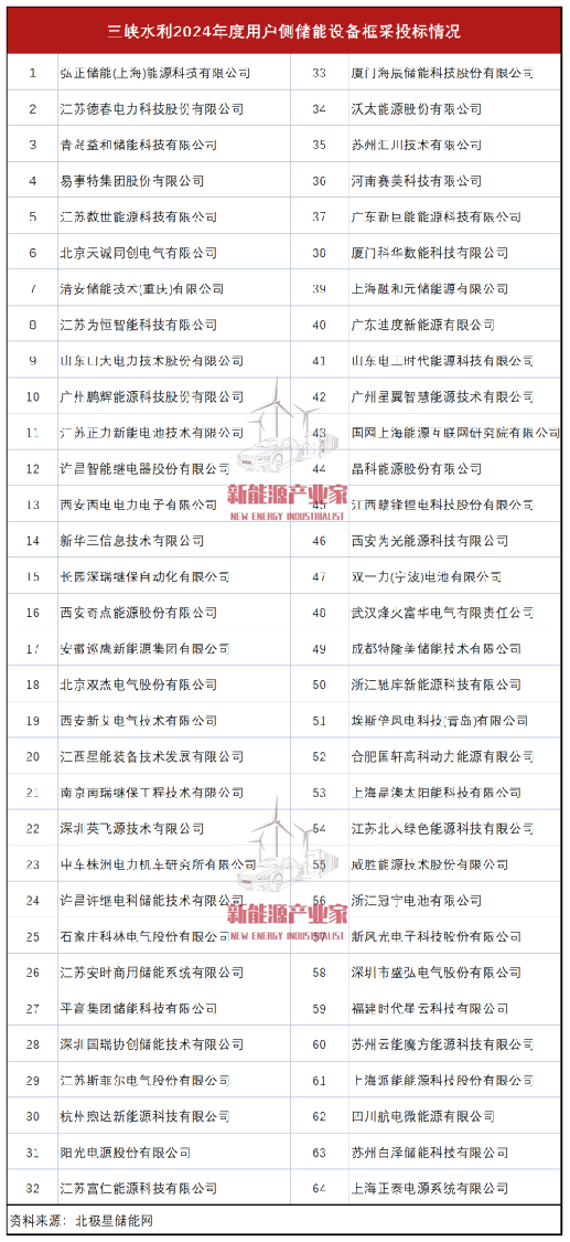 不久前,三峽水利2024年度用戶側(cè)儲能設(shè)備框架協(xié)議采購,總共有64家企業(yè)投標(biāo)。