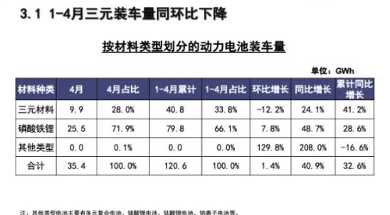 中國汽車動力電池產(chǎn)業(yè)創(chuàng)新聯(lián)盟4月統(tǒng)計數(shù)據(jù)顯示,磷酸鐵鋰電池裝車量占總裝車量71.9%。