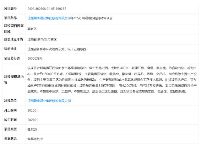 該項目編號為2405-360598-04-05-769372,項目名稱為“江西贛鋒鋰業(yè)集團股份有限公司年產5萬噸鋰電新能源材料項目”。贛鋒鋰業(yè)作為建設單位,此次項目的開工時間定于2025年1月,預計竣工時間為2027年1月,項目類型為備案類,目前備案狀態(tài)為備案審核中。