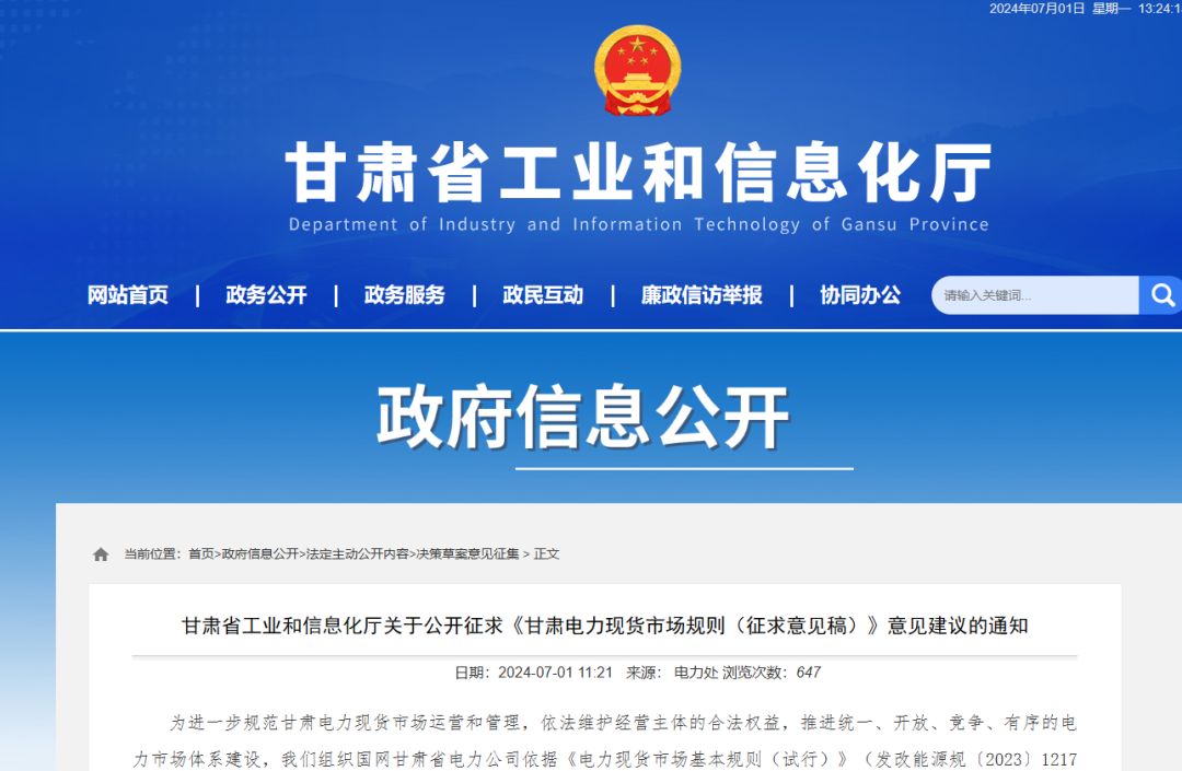 甘肅省工業(yè)和信息化廳關(guān)于公開征求《甘肅電力現(xiàn)貨市場(chǎng)規(guī)則(征求意見稿)》意見建議的通知