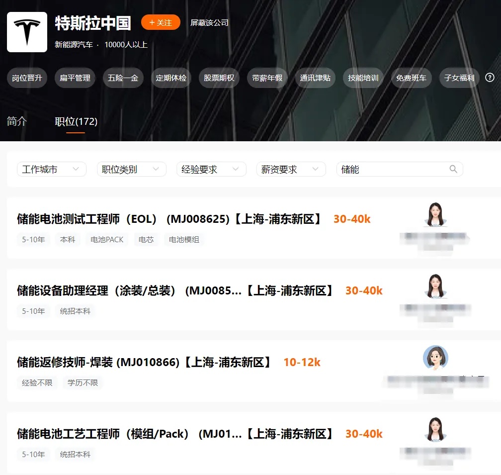 而有消息顯示,特斯拉給予上海地區(qū)儲能產(chǎn)品工程師(Megepack)的待遇為35~65k;對于上海地區(qū)儲能項目經(jīng)理待遇為30~60k。