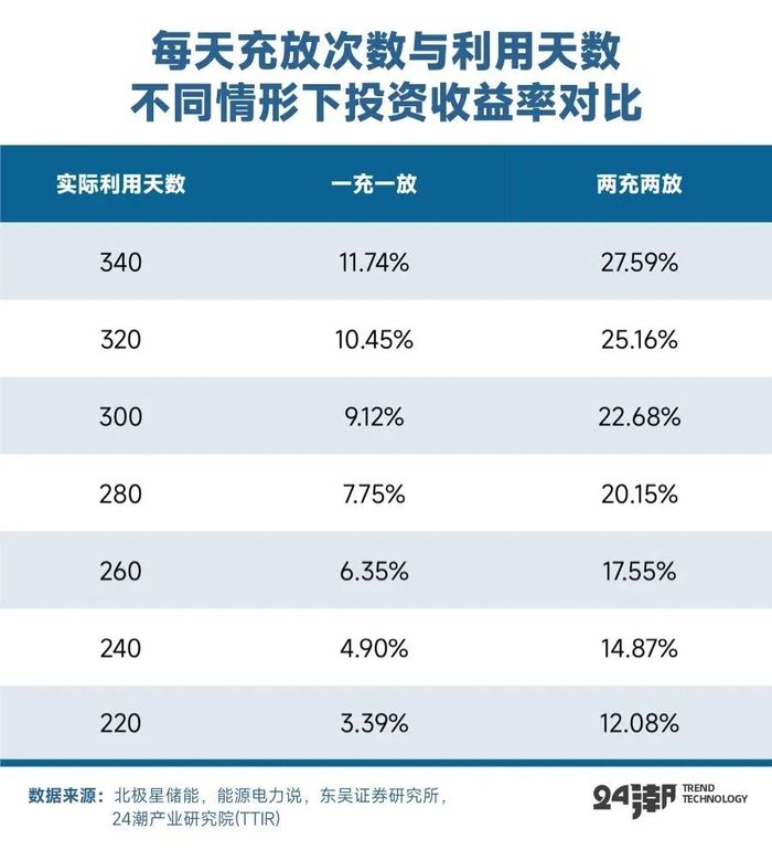 還需要注意的是,據(jù)東吳證券測(cè)算,工商儲(chǔ)實(shí)際應(yīng)用中收益率低于理論值,對(duì)工商業(yè)業(yè)主吸引力有限。工商儲(chǔ)單個(gè)項(xiàng)目功率較大,初始投資成本約上千萬元,此外分時(shí)電價(jià)政策變化的不確定性、若實(shí)際利用天數(shù)較低,收益率將打較大折扣,每天同一充放次數(shù)下,220天利用天數(shù)與340天利用天數(shù)可產(chǎn)生近2倍收益率差異??紤]目前實(shí)際利用是一充一放為主,280利用天數(shù)下IRR為7.75%。