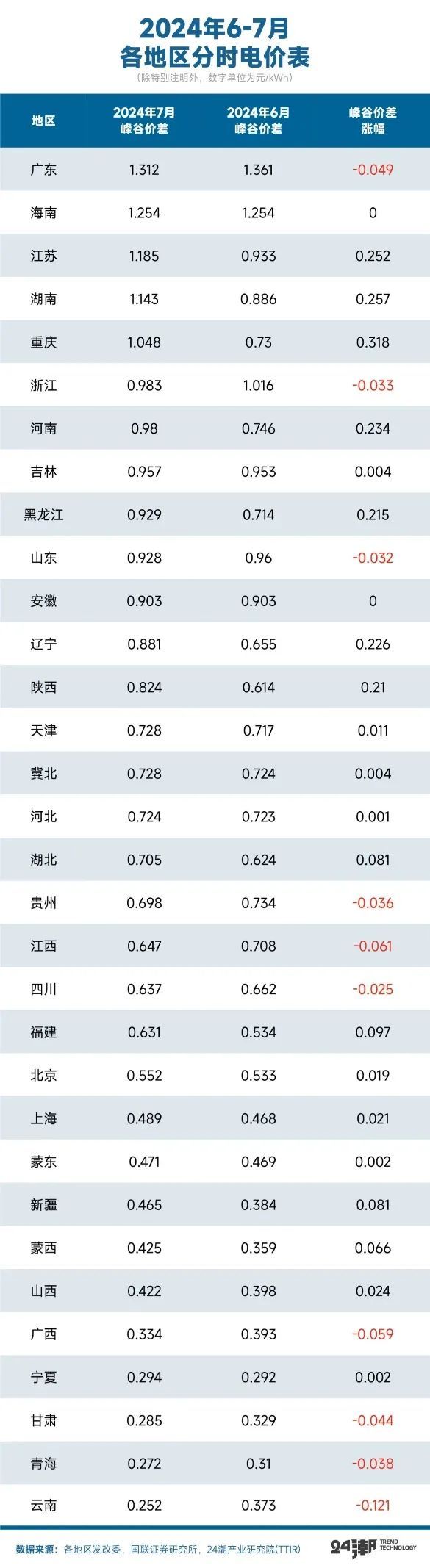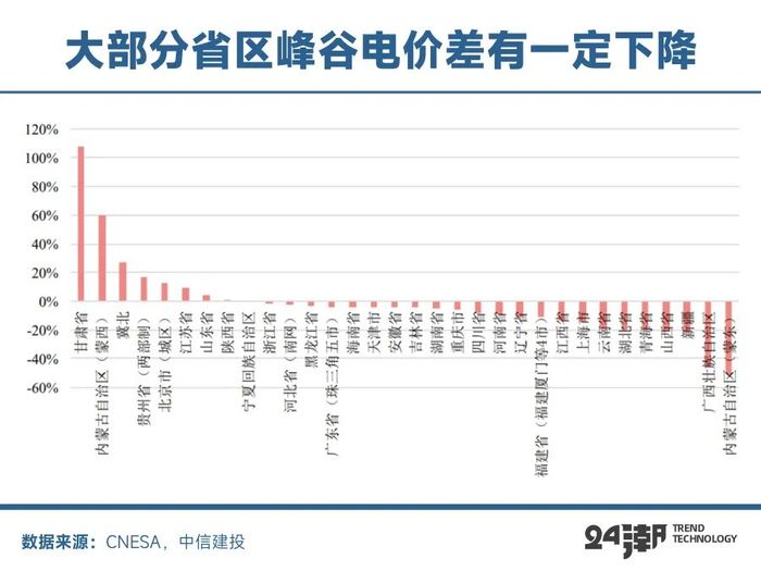 這并非危言聳聽,根據(jù)東海證券統(tǒng)計(jì),今年以來浙江、河南、江蘇多地發(fā)布分時(shí)電價(jià)調(diào)整政策,全國范圍內(nèi)峰谷電價(jià)差縮窄趨勢(shì)顯著,河南省分時(shí)電價(jià)調(diào)整新政亦正式落地。此外根據(jù)中關(guān)村儲(chǔ)能聯(lián)盟對(duì)32個(gè)省區(qū)的分析,今年1-8月份一般工商業(yè)1-10kV電網(wǎng)代理購電最大峰谷價(jià)差平均為0.68元/kWh,較2023年同比下降了6.7%。與2023年1-8月相比,今年各地最大峰谷價(jià)差普遍呈現(xiàn)下降趨勢(shì),僅甘肅、蒙西、冀北等8個(gè)地區(qū)價(jià)差有所提高,其他地區(qū)均為下降。