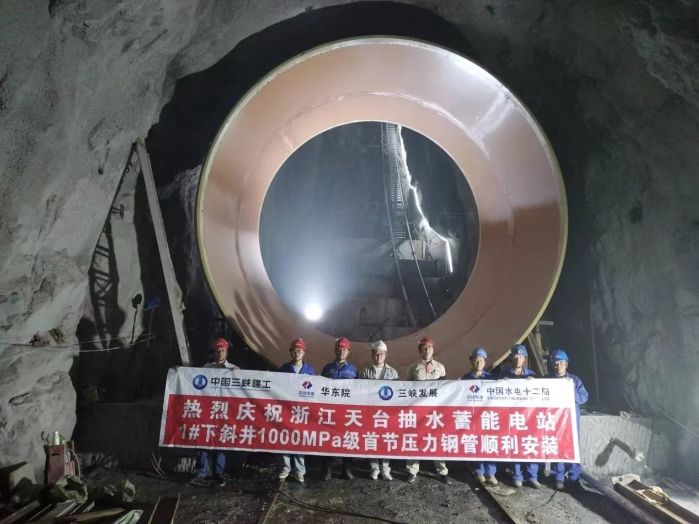 9月29日,天臺(tái)抽蓄電站1號下斜井首節(jié)壓力鋼管也實(shí)現(xiàn)順利安裝,拉開了國內(nèi)最長單級斜井安裝序幕。據(jù)了解,1號下斜井長度483米,其中上彎段和直線段采用800兆帕級鋼板襯砌,下彎段采用1000兆帕級鋼板襯砌。