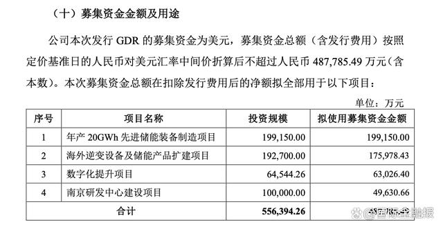 此次發(fā)行GDR的募集資金為美元,募集資金總額(含發(fā)行費用)折算后不超過人民幣48.78億元。所募資金在扣除發(fā)行費用后,將全部用于年產(chǎn)20GWh先進(jìn)儲能裝備制造項目、海外逆變設(shè)備及儲能產(chǎn)品擴建項目、數(shù)字化提升項目以及南京研發(fā)中心建設(shè)項目。