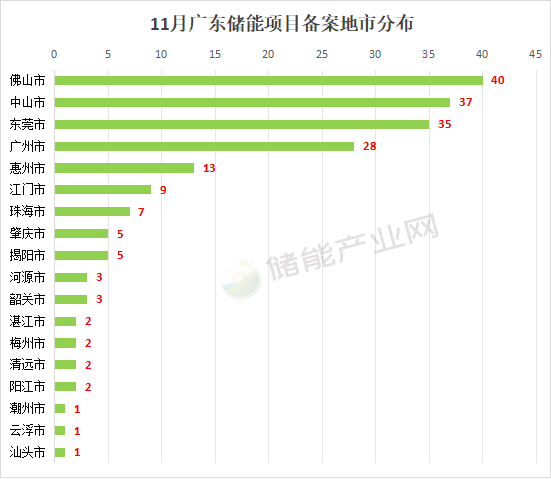 從各地市分布情況來看,儲能備案項(xiàng)目地市分布數(shù)量排名第一的佛山,為40個(gè);中山、東莞位列第二和第三,分別為37個(gè)和35個(gè)。前三名備案數(shù)量已經(jīng)占據(jù)廣東省57%以上。