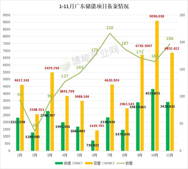 從1-11月廣東儲能項(xiàng)目備案情況來看,11月備案數(shù)量有196個(gè),相較于10月,數(shù)量上有所增加,但儲能項(xiàng)目備案規(guī)模出現(xiàn)下滑,合計(jì)為3420.612MW/6852.422MWh,規(guī)模下降的主要是因?yàn)榇笮蛢δ茈娬卷?xiàng)目的減少,大部分為用戶側(cè)工商業(yè)儲能項(xiàng)目。