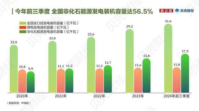中國電力企業(yè)聯(lián)合會統(tǒng)計數(shù)據(jù)顯示,截至2024年9月底,全國全口徑發(fā)電裝機容量31.6億千瓦,煤電占總發(fā)電裝機容量的比重為37.3%,同比降低4.4個百分點;非化石能源發(fā)電裝機容量17.9億千瓦,同比增長24.0%,占總裝機容量比重為56.5%,比上年同期提高4.5個百分點。這表明中國能源結(jié)構持續(xù)優(yōu)化,清潔能源在總裝機中的重力提升,為實現(xiàn)“雙碳”目標奠定了基礎。