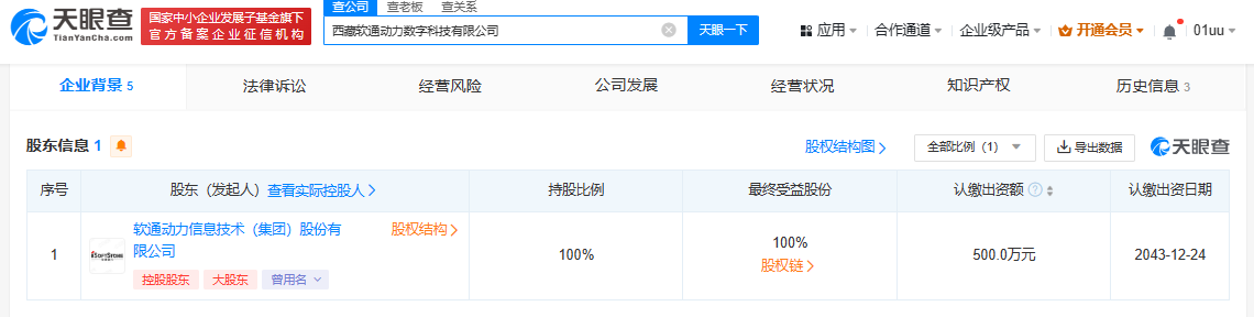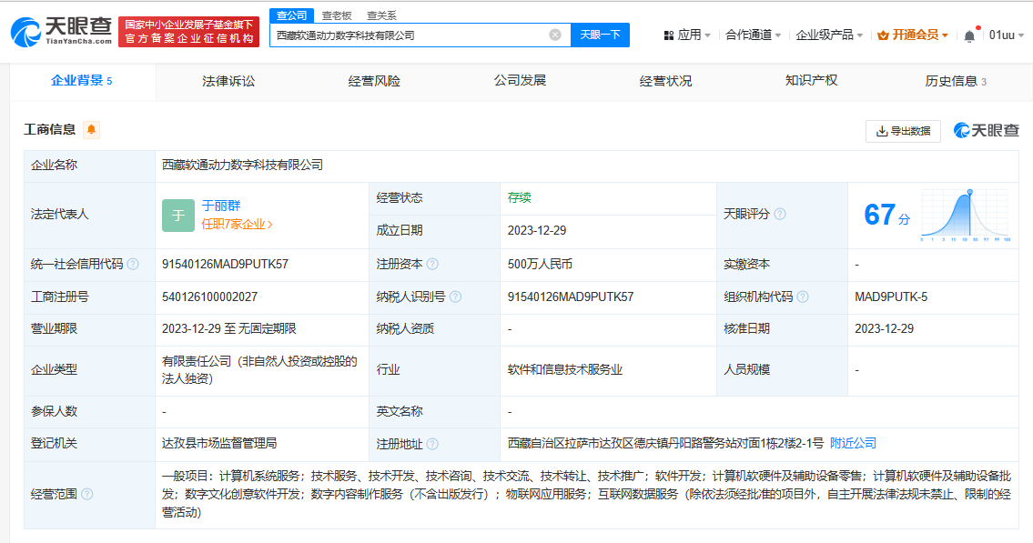 近日,西藏軟通動力數(shù)字科技有限公司成立,法定代表人為于麗群,注冊資本500萬人民幣,經(jīng)營范圍包括數(shù)字文化創(chuàng)意軟件開發(fā)、數(shù)字內(nèi)容制作服務(wù)、物聯(lián)網(wǎng)應用服務(wù)、互聯(lián)網(wǎng)數(shù)據(jù)服務(wù)等。股東信息顯示,該公司由軟通動力(301236)全資持股。