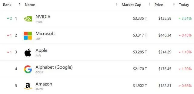 當(dāng)?shù)貢r(shí)間周二美股收盤(pán),美國(guó)芯片企業(yè)英偉達(dá)上漲3.51%,報(bào)135.58美元再刷歷史新高,總市值達(dá)3.335萬(wàn)億美元,一舉超過(guò)了微軟和蘋(píng)果,成為全球最具價(jià)值的上市公司。