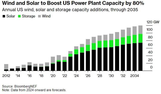 根據(jù)BloombergNEF預測數(shù)據(jù),預計到2035年,美國總發(fā)電量將增加80%,主要得益于近1太瓦的新增太陽能和風能。