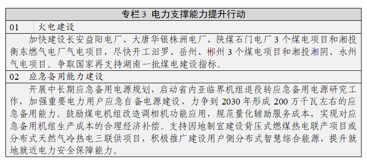 (八)提升電力應(yīng)急備用能力。加強(qiáng)極端形勢下電力風(fēng)險(xiǎn)管控,做好應(yīng)對自然災(zāi)害、尖峰負(fù)荷、大面積停電、電網(wǎng)攻擊等情況的保供預(yù)案,提高應(yīng)急處置和抗災(zāi)能力。開展中長期應(yīng)急備用電源規(guī)劃,按照最大負(fù)荷3%—4%疊加新能源裝機(jī)容量1%—3%標(biāo)準(zhǔn)配置應(yīng)急備用電源規(guī)模。落實(shí)國家應(yīng)急備用電源管理要求,科學(xué)認(rèn)定和退出應(yīng)急備用機(jī)組,對符合能效、環(huán)保、安全等政策和標(biāo)準(zhǔn)要求的退役火電機(jī)組,按照“關(guān)而不拆”原則轉(zhuǎn)為應(yīng)急備用電源,做好設(shè)備維護(hù)和燃料供應(yīng)保障。支持分布式天然氣發(fā)電項(xiàng)目建設(shè),在有規(guī)模熱(冷)負(fù)荷的工業(yè)園區(qū)、經(jīng)濟(jì)開發(fā)區(qū)、空港新區(qū)等區(qū)域,因地制宜建設(shè)背壓式燃煤熱電聯(lián)產(chǎn)項(xiàng)目或分布式天然氣冷熱電三聯(lián)供項(xiàng)目,積極推廣建設(shè)用戶側(cè)分布式智慧綜合能源,提升就地就近電力安全保障能力。加強(qiáng)政府、醫(yī)院、鐵路、民航等重要電力用戶應(yīng)急自備電源建設(shè),力爭實(shí)現(xiàn)應(yīng)配盡配全面覆蓋,電源容量應(yīng)滿足全部保安負(fù)荷需求。加強(qiáng)抽水蓄能電站應(yīng)急備用能力建設(shè),推動(dòng)抽水蓄能電站具備黑啟動(dòng)功能。做好一次能源監(jiān)測預(yù)警和供應(yīng)協(xié)調(diào),提升電源發(fā)電能力,利用負(fù)荷和電源的時(shí)空互補(bǔ)特性,有效提高湖南與其他區(qū)域間電力互補(bǔ)互濟(jì)、調(diào)劑余缺能力。