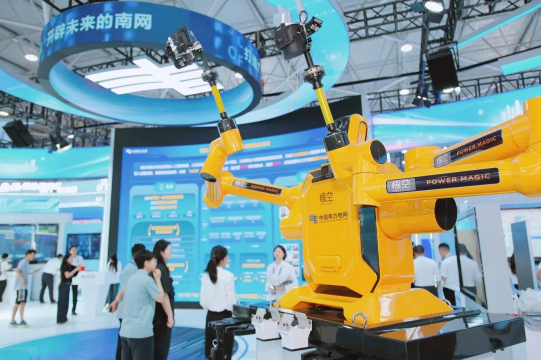 在數(shù)博會(huì)南網(wǎng)主展廳,“大瓦特”具身機(jī)器人和吠云組成的“機(jī)器人戰(zhàn)隊(duì)”亮相。(南網(wǎng)傳媒公司 供圖)