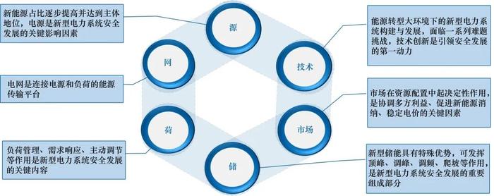 新型電力系統(tǒng)是實現(xiàn)“雙碳”目標(biāo)、重塑能源安全格局的重要載體,構(gòu)建新型電力系統(tǒng)是提高能源安全韌性的根本性舉措。新型電力系統(tǒng)的安全發(fā)展主要受到源、網(wǎng)、荷、儲、市場、技術(shù)六大因素的綜合影響(見圖1)。