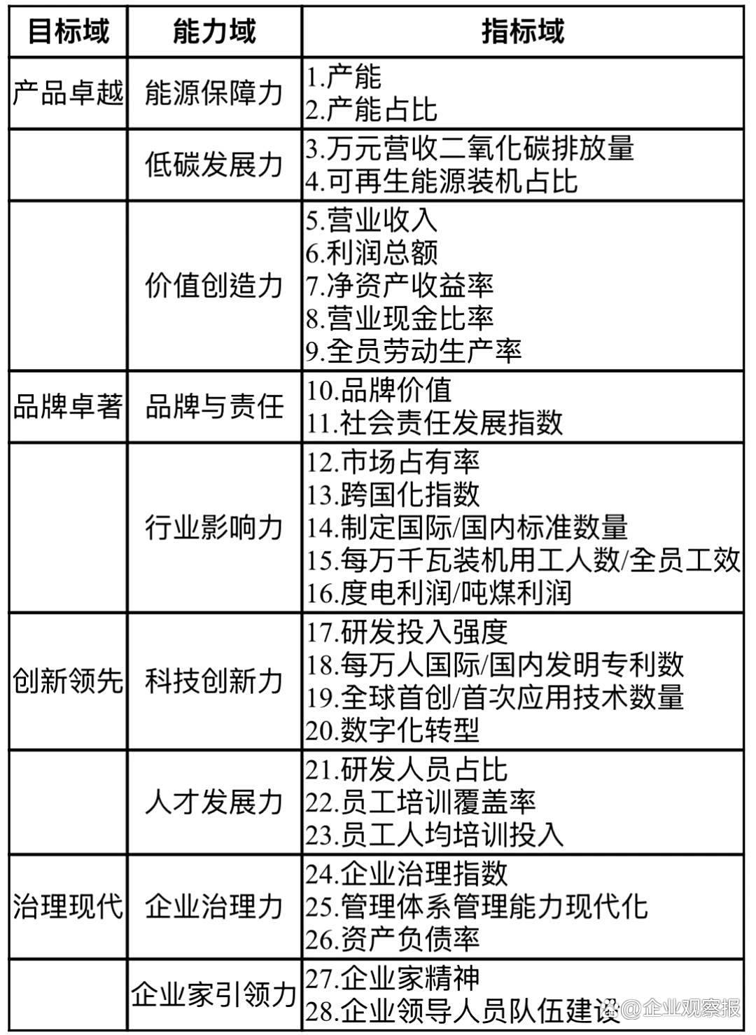 在構(gòu)建了目標(biāo)域與能力域的關(guān)系基礎(chǔ)上,以產(chǎn)品卓越、品牌卓著、創(chuàng)新領(lǐng)先、治理現(xiàn)代為目標(biāo),由每項(xiàng)關(guān)鍵能力延伸出具體指標(biāo),從而形成三級(jí)結(jié)構(gòu)的世界一流能源電力企業(yè)對(duì)標(biāo)指標(biāo)體系,見(jiàn)表1。指標(biāo)體系共包含28項(xiàng)具體指標(biāo):第一級(jí)包含4個(gè)維度,分別是產(chǎn)品卓越、品牌卓著、創(chuàng)新領(lǐng)先、治理現(xiàn)代;第二級(jí)是以第一級(jí)指標(biāo)為目標(biāo)、結(jié)合能源電力企業(yè)經(jīng)營(yíng)發(fā)展的特征及趨勢(shì)而確定的8項(xiàng)關(guān)鍵成功要素,分別是產(chǎn)品保障力、價(jià)值創(chuàng)造力、品牌與責(zé)任、行業(yè)影響力、科技創(chuàng)新力、商業(yè)創(chuàng)新力、治理力以及企業(yè)家引領(lǐng)力;第三級(jí)是第二級(jí)指標(biāo)延伸的28項(xiàng)指標(biāo),涵蓋了國(guó)務(wù)院國(guó)資委關(guān)于世界一流企業(yè)的評(píng)價(jià)指標(biāo)和中央企業(yè)的年度考核指標(biāo),反映了企業(yè)包含科技創(chuàng)新、行業(yè)引領(lǐng)和社會(huì)責(zé)任等方面的綜合實(shí)力和水平。