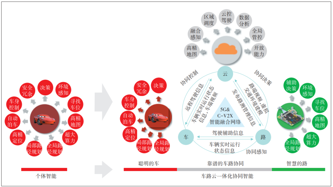 隨著車輛智能化水平的不斷提高,車載計算設備的算力逐漸難以滿足復雜路況下實時處理大量數據的需求,既是成本瓶頸,也是能力瓶頸。為解決這一問題,行業(yè)研究出車路云一體化的技術演進路線(見圖5)。此方案體系下,車輛通過高速穩(wěn)定的通信網絡與云端服務器、道路感知設備進行實時數據交互。云端強大的計算能力既可對車輛上傳的大量傳感器數據進行快速處理和分析,也可處理道路感知設備上報的實時道路信息和交通狀況。平臺綜合分析后將決策指令及時反饋給車輛,從而輔助車輛做出更精準的決策。車路云一體化的技術方案可有效彌補車輛自身算力不足,進一步提升智能網聯(lián)車輛的運行效率和安全性,并為降低智能駕駛成本推動智能網聯(lián)汽車快速普及,助力智能交通發(fā)展提供堅實基礎。