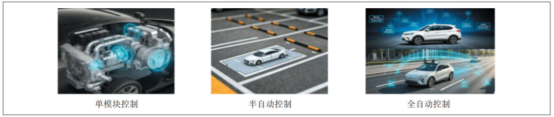 智能網聯(lián)汽車的技術演進歷程一般分為3個階段(見圖4)。第1階段是單模塊控制階段,車輛各個關鍵部件如動力系統(tǒng)、制動系統(tǒng)等都各自配備獨立的控制模塊,模塊之間協(xié)同性較差,只能實現(xiàn)基礎、相對簡單的功能,例如簡單的定速巡航,車輛無法自主應對復雜路況;第2階段是半自動控制階段,部分駕駛任務可以由車輛自動完成,例如記憶泊車功能,車輛能夠自動識別停車位并精準控制轉向、速度等完成泊車動作,但仍需要駕駛員參與;第3階段是全自動控制階段,車輛已達成真正意義上的高度智能化與自主化。車輛依托自身及周邊環(huán)境多傳感器融合技術構建起全方位、高精度的環(huán)境感知體系,并基于云端智能網聯(lián)平臺的強大賦能,具備強大的駕駛決策能力,可實時調整行駛策略以應對復雜多變交通場景,全程無需駕駛員任何干預。