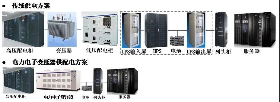 數(shù)據(jù)中心傳統(tǒng)的UPS供電方案,是由高壓配電柜、變壓器、低壓配電柜、UPS等組成,雖然系統(tǒng)方案成熟,但由于設(shè)備種類數(shù)量多,電能變換環(huán)節(jié)多,占地面積大,轉(zhuǎn)換效率低,已有被逐步淘汰的趨勢(shì)。