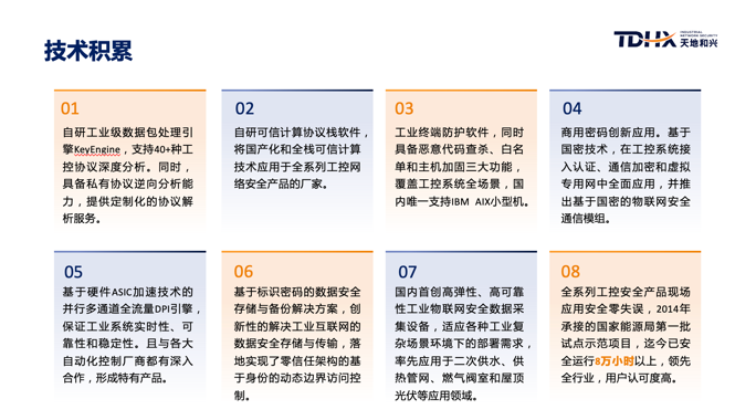 本次活動(dòng)中,副總裁楊小帥更近一步向大家介紹了天地和興深厚的技術(shù)積累:自研工業(yè)級(jí)數(shù)據(jù)包處理引擎KeyEngine,支持40+種工控協(xié)議深度分析;自研可信計(jì)算協(xié)議棧軟件,是將國產(chǎn)化和全棧可信計(jì)算技術(shù)應(yīng)用于全系列工控網(wǎng)絡(luò)安全產(chǎn)品的廠商;工業(yè)終端防護(hù)軟件,覆蓋工控系統(tǒng)全場(chǎng)景,還是國內(nèi)唯一支持IBM AIX小型機(jī);商用密碼創(chuàng)新應(yīng)用,并推出基于國密的物聯(lián)網(wǎng)安全通信模組;基于硬件ASIC加速技術(shù)的并行多通道全流量DPI引擎,保證工業(yè)系統(tǒng)實(shí)時(shí)性、可靠性和穩(wěn)定性;基于標(biāo)識(shí)密碼的數(shù)據(jù)安全存儲(chǔ)與備份解決方案,創(chuàng)新性的解決工業(yè)互聯(lián)網(wǎng)的數(shù)據(jù)安全存儲(chǔ)與傳輸;國內(nèi)首創(chuàng)高彈性、高可靠性工業(yè)物聯(lián)網(wǎng)安全數(shù)據(jù)采集設(shè)備,適應(yīng)各種工業(yè)復(fù)雜場(chǎng)景環(huán)境下的部署需求;全系列工控安全產(chǎn)品現(xiàn)場(chǎng)應(yīng)用安全零失誤,2014年承接的國家能源局第一批試點(diǎn)示范項(xiàng)目,迄今已安全運(yùn)行8萬小時(shí)以上。