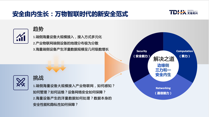 工業(yè)和信息化部研究機(jī)構(gòu)數(shù)據(jù)顯示:我國工業(yè)互聯(lián)網(wǎng)產(chǎn)業(yè)規(guī)模目前已邁過了“萬億”大關(guān),并進(jìn)一步刺激了數(shù)字經(jīng)濟(jì)在工業(yè)領(lǐng)域的廣泛應(yīng)用,工業(yè)制造的數(shù)字化和網(wǎng)絡(luò)化催生出巨大的網(wǎng)絡(luò)安全需求。天地和興CTO李凱斌介紹:數(shù)字經(jīng)濟(jì)大背景下,萬物智聯(lián)時(shí)代將面臨新安全挑戰(zhàn),即:1、端側(cè)海量設(shè)備大規(guī)模接入產(chǎn)業(yè)物聯(lián)網(wǎng),如何感知?如何管理?如何運(yùn)維?設(shè)備網(wǎng)絡(luò)安全如何保障?2、海量設(shè)備產(chǎn)生的洋量數(shù)據(jù)如何處理?數(shù)據(jù)本身的安全性能和隱私性如何保障?而解決之道在于“三力合一”:安全能力、算力、通信能力,三者合一。安全,由內(nèi)生長(zhǎng)。