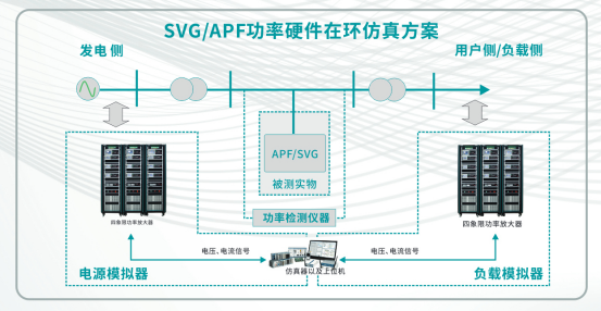 在電力系統(tǒng)應(yīng)用場景中,PAS放大器與仿真器的結(jié)合,能夠?qū)Πl(fā)電側(cè)和負(fù)載側(cè)進(jìn)行數(shù)字化模擬,結(jié)合功率檢測儀的實測數(shù)據(jù),通過數(shù)據(jù)采集系統(tǒng),可實現(xiàn)以APF,SVG為被測設(shè)備的半實物功率硬件在環(huán)仿真測試。