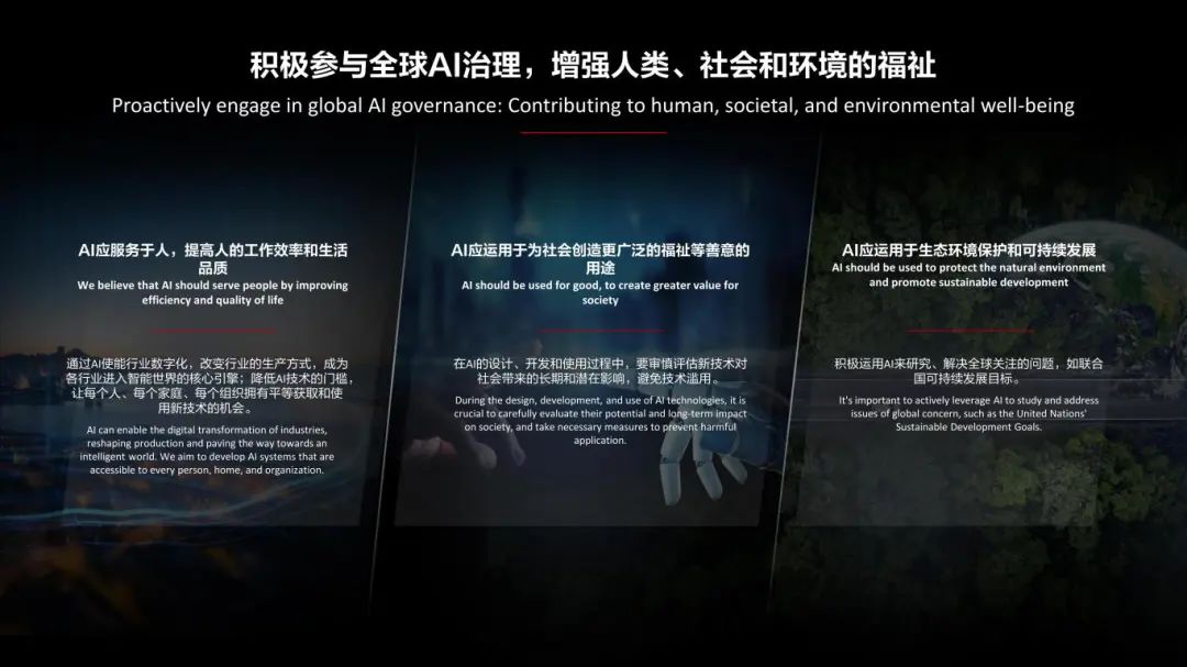 我們認為AI應服務于人,提高人的工作效率和生活品質(zhì),通過AI使能行業(yè)數(shù)字化,改變行業(yè)的生產(chǎn)方式,成為各行業(yè)進入智能世界的核心引擎;要持續(xù)降低AI的技術門檻,讓每個人、每個家庭、每個組織擁有平等獲取和使用新技術的機會。同時,AI應運用于為社會創(chuàng)造更廣泛的福祉等善意的用途,在AI的設計、開發(fā)和使用過程中,要審慎評估新技術對社會帶來的長期和潛在影響,避免技術濫用。以及,AI應運用于生態(tài)環(huán)境保護和可持續(xù)發(fā)展,積極運用AI來研究、解決全球關注的問題,如聯(lián)合國可持續(xù)發(fā)展目標。