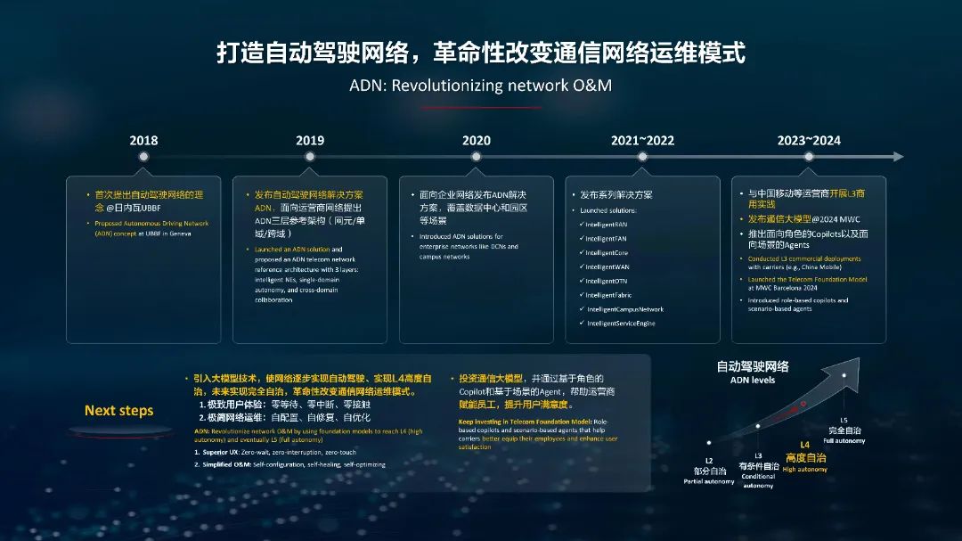 ? 打造自動駕駛網(wǎng)絡,革命性改變通信網(wǎng)絡運維模式。電信運營商網(wǎng)絡運維是非常復雜的,因此成本也非常高。因此在2018年的日內(nèi)瓦UBBF,華為參考汽車自動駕駛的分級理念提出了自動駕駛網(wǎng)絡的概念,也就是ADN(Autonomous Driving Network)。經(jīng)過這么多年和電信運營商持續(xù)的探討、聯(lián)合創(chuàng)新,形成了大量的ADN解決方案,到今天,ADN已經(jīng)成為網(wǎng)絡運維智能化轉(zhuǎn)型的戰(zhàn)略共識。而大模型出來以后,自動駕駛網(wǎng)絡的目標更加具有現(xiàn)實意義了,運營商都希望自己的網(wǎng)絡能夠盡快實現(xiàn)自動駕駛、實現(xiàn)L4高度自治,未來實現(xiàn)完全自治,帶來以“零等待、零中斷、零接觸”為標志的極致的用戶體驗,和以“自配置、自修復、自優(yōu)化”為標志的極簡的網(wǎng)絡運維。華為將與中國及全球運營商合作打造通信大模型,并首先通過基于角色的Copilot和基于場景的Agent,幫助運營商賦能員工,提升用戶滿意度,讓運營商盡快因大模型技術和自動駕駛網(wǎng)絡而獲益。