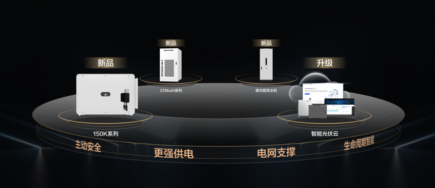 此次重點(diǎn)推出了150K更大功率工商業(yè)逆變器、行業(yè)首款風(fēng)液智冷工商業(yè)儲(chǔ)能、360kW/480kW液冷超充主機(jī)、全新升級的智能光伏云等。