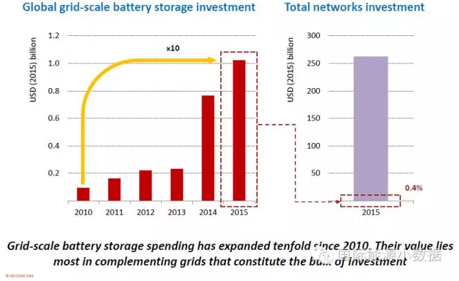 特別值得一提的是,2011年以來全球在可再生能源發(fā)電投資基本平穩(wěn),但是由于可再生能源成本的下降,每年新增的可再生能源發(fā)電量逐年增加,2015年超出2011年33%。此外,電力儲(chǔ)能投資2015年超過100億美元,是2010年的10倍;但是儲(chǔ)能投資僅占電網(wǎng)投資的0.4%,還有很長(zhǎng)的路要走。