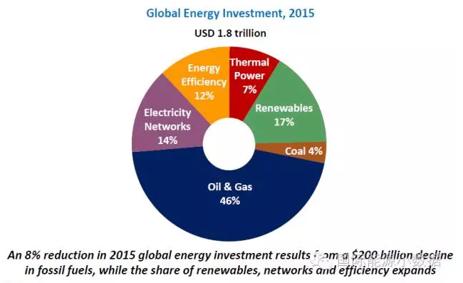 雖說油氣投資大幅下降,但是在全球1.83萬億的能源投資總額中,油氣投資占比達(dá)到46%。可再生能源投資占17%;火電發(fā)電廠投資占7%,電力輸配網(wǎng)投資占14%;能效投資占12%;煤炭開采和運(yùn)輸投資僅占4%。