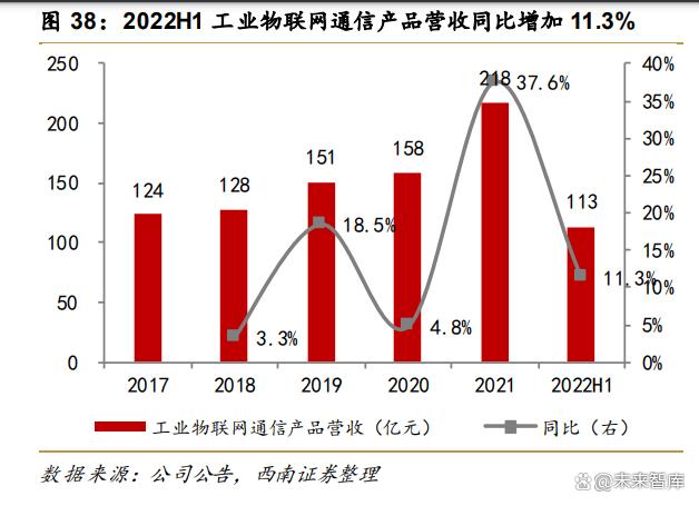 公司系工業(yè)物聯(lián)網(wǎng)龍頭,產(chǎn)品適用范圍廣。公司深耕工業(yè)物聯(lián)網(wǎng)二十年,在智能電力、 智能制造、智能零售、智慧城市等領(lǐng)域積累了諸多國(guó)內(nèi)外優(yōu)質(zhì)客戶,市場(chǎng)涵蓋中國(guó)、美國(guó)、 德國(guó)、英國(guó)等全球主要發(fā)達(dá)工業(yè)國(guó)家,良好的客戶資源為公司持續(xù)穩(wěn)定發(fā)展提供了有力保障。 工業(yè)物聯(lián)網(wǎng)通信產(chǎn)品可適用于各種工業(yè)領(lǐng)域,用于各種無(wú)人值守環(huán)境下工業(yè)設(shè)備的聯(lián)網(wǎng), 2021 年工業(yè)物聯(lián)網(wǎng)通信產(chǎn)品營(yíng)收達(dá) 218 億元,同比高增 37.6%,2022H1 營(yíng)收 113 億元, 同比增加 11.3%。