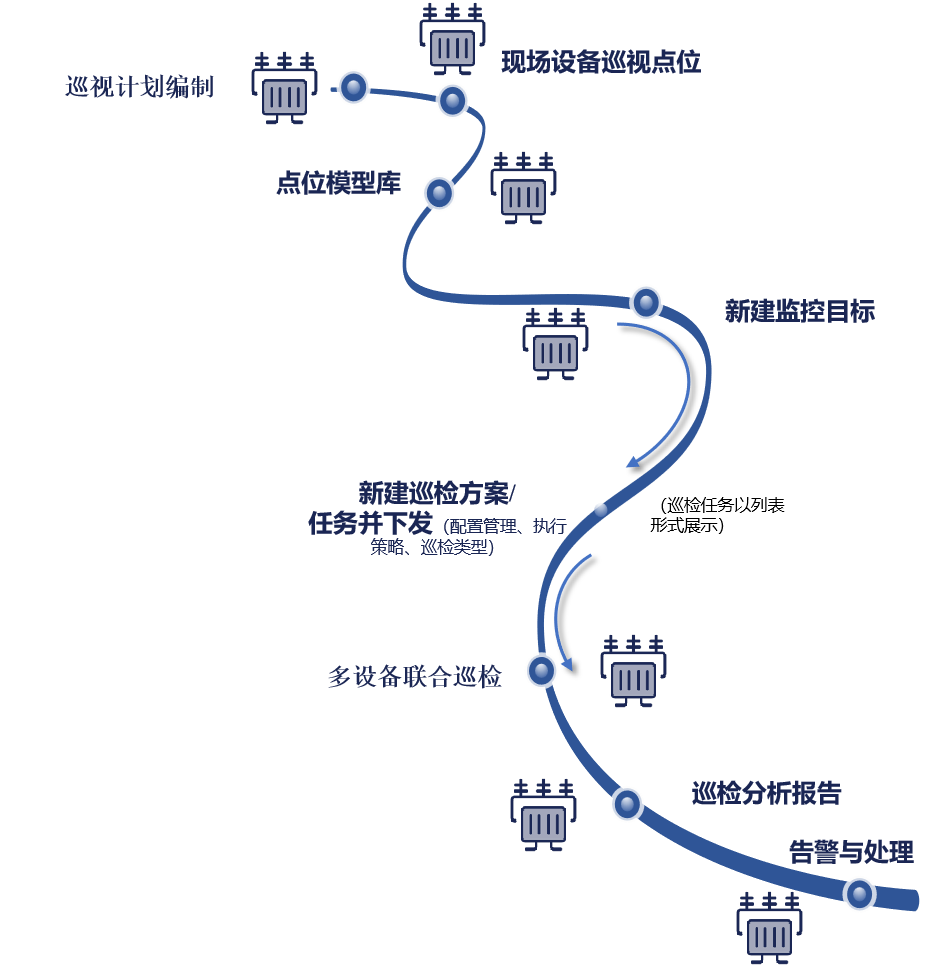 同時,針對變電站內攝像機、機器人、無人機、在線監(jiān)測等多種感知及智能巡視設備間缺乏聯動機制現象,江行智能開發(fā)變電遠程智能巡視系統,可將上述多種智能巡視設備納入系統管控,并設計聯合巡檢策略,最大程度挖掘智能設備價值,提升設備利用率及巡視作業(yè)智能化水平。