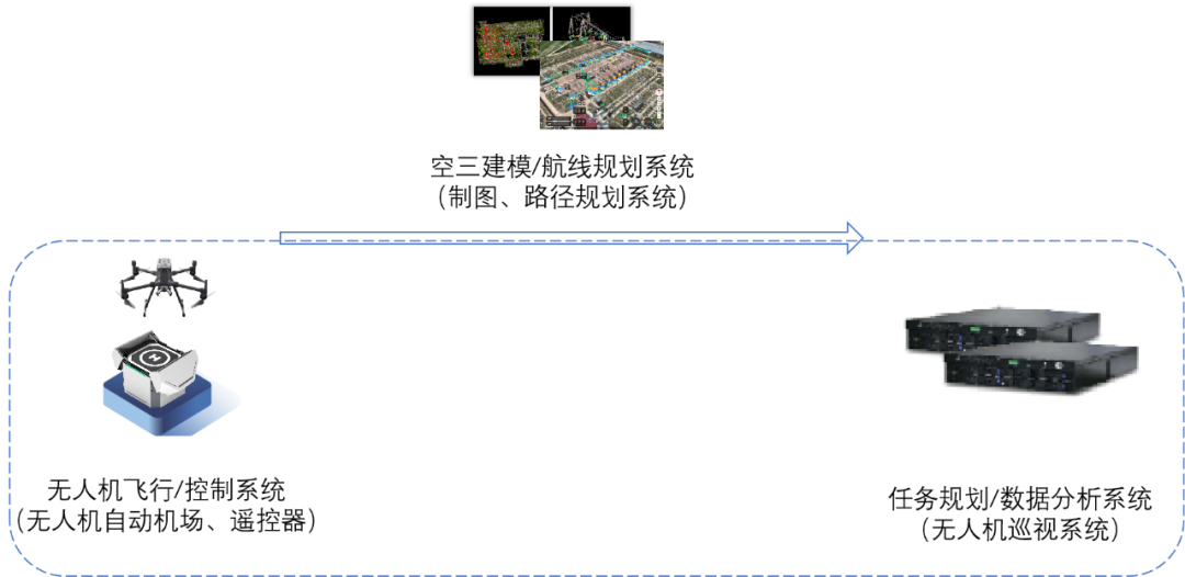 江行智能無人機智能巡視系統主要由無人機飛行/控制系統、空三建模/航線規(guī)劃系統、任務規(guī)劃/數據分析系統三大部分組成,通過采集現場圖片、建立現場模型、規(guī)劃巡視航線、配置算法/點位、制定飛行計劃,進而定時下發(fā)飛行任務,完成數據分析、報告、消缺等任務。