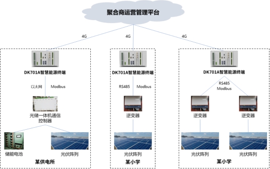 基于DK701智能終端平臺的優(yōu)勢特性,目前江行智能已成功開發(fā)DK701A智慧能源終端和DK701E儲能EMS就地控制器,并應用到虛擬電廠聚合商運營管理系統(tǒng)及數(shù)字配電網臺區(qū)儲能等項目建設,在光伏、儲能、充電樁等具體場景發(fā)揮了重要作用。以國網寧夏某公司打造的聚合商運營管理系統(tǒng)為例,通過在供電所、小學配置智慧能源終端,可將自身所擁有的分布式光伏、分布式儲能、電采暖等可調節(jié)資源數(shù)據(jù)接入省級虛擬電廠運營管理平臺,實現(xiàn)對可調節(jié)資源的可觀、可測、可調、可控。