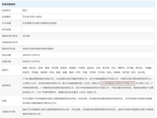 本網(wǎng)訊 2023年11月1日,中國信息協(xié)會發(fā)布《科學數(shù)據(jù)安全能力成熟度評估規(guī)范》團體標準,并于11月1日起開始實施。網(wǎng)御星云作為主筆單位深度參與標準的編制,牽頭標準起草、修訂等一系列工作。