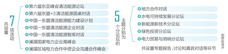 本次中國—東盟清潔能源合作周以“跨越山海 共享未來”為主題,活動期間將舉辦第六屆東亞峰會清潔能源論壇、第六屆東盟+3清潔能源圓桌對話、中國—東盟清潔能源能力建設計劃、中國—東盟清潔能源企業(yè)對話、中國—東盟清潔能源智庫對話、瀾湄國家電力企業(yè)高峰會、瀾湄區(qū)域電力合作中資企業(yè)溝通合作峰會等7項活動。5場分論壇的主題分別為“地方合作對話”“水電可持續(xù)發(fā)展分論壇”“新能源新技術分論壇”“綠色投資分論壇”“電力貿易與消納分論壇”,設置了專題報告、討論和嘉賓對話等環(huán)節(jié)。