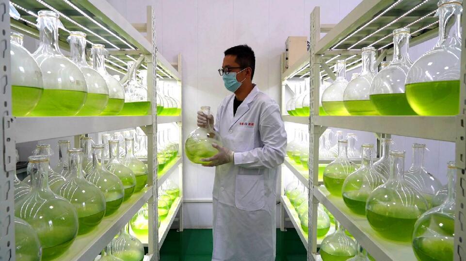 形態(tài)各異的容器中,微藻或深或淺、綠意萌動……山西安泰集團公司利用自主研發(fā)系統(tǒng)捕捉燃煤煙氣所含的二氧化碳,作為微生物微藻的生長基,生成高附加值、高營養(yǎng)價值的藻粉產(chǎn)品。
