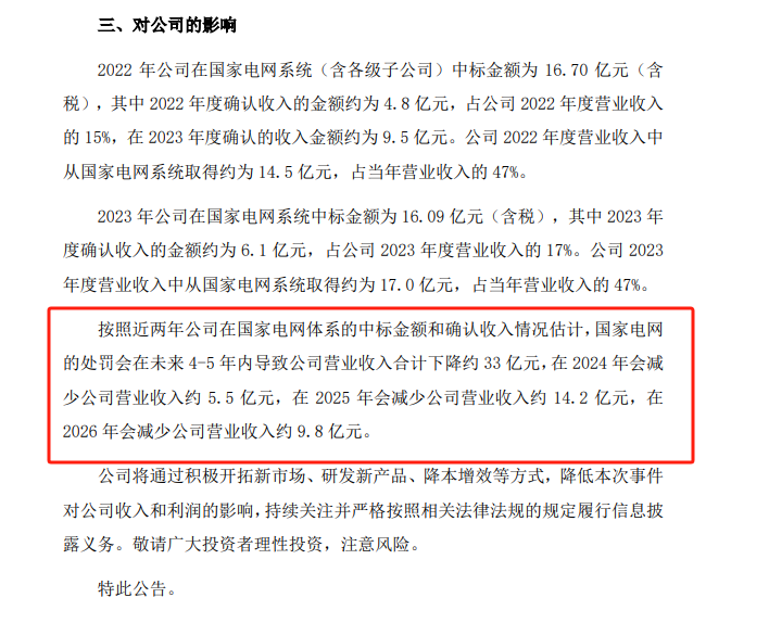 公告顯示,2022年鼎信通訊在國家電網(wǎng)系統(tǒng)(含各級子公司)中標金額為16.7億元(含稅),其中2022年度確認收入的金額約為4.8億元,占公司2022年度營業(yè)收入的15%。公司2022年度營業(yè)收入中,從國家電網(wǎng)系統(tǒng)取得約14.5億元,占當年營業(yè)收入的47%。2023年,鼎信通訊在國家電網(wǎng)系統(tǒng)中標金額為16.09億元(含稅),其中2023年度確認收入的金額約為6.1億元,占公司2023年度營業(yè)收入的17%。公司2023年度營業(yè)收入中,從國家電網(wǎng)系統(tǒng)取得約17億元,占當年營業(yè)收入的47%。按照近兩年公司在國家電網(wǎng)體系的中標金額和確認收入情況估計,國家電網(wǎng)的處罰會在未來4-5年內(nèi)導致公司營業(yè)收入合計下降約33億元,在2024年會減少公司營業(yè)收入約5.5億元,在2025年會減少公司營業(yè)收入約14.2億元,在2026年會減少公司營業(yè)收入約9.8億元。