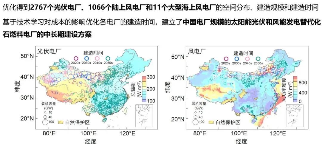 “我們根據(jù)多年太陽輻射和風(fēng)速的小時(shí)空間數(shù)據(jù),綜合考慮國家行政區(qū)劃、土地類型、氣候條件、等空間地理信息,同時(shí)基于五種不同的電廠形態(tài)分布和電廠各組件成本,優(yōu)化出2767個(gè)光伏電廠、1066個(gè)陸上風(fēng)電廠和11個(gè)大型海上風(fēng)電廠的空間分布和建造規(guī)模,并基于技術(shù)學(xué)習(xí)對(duì)成本的影響優(yōu)化各電廠的建造時(shí)間。”