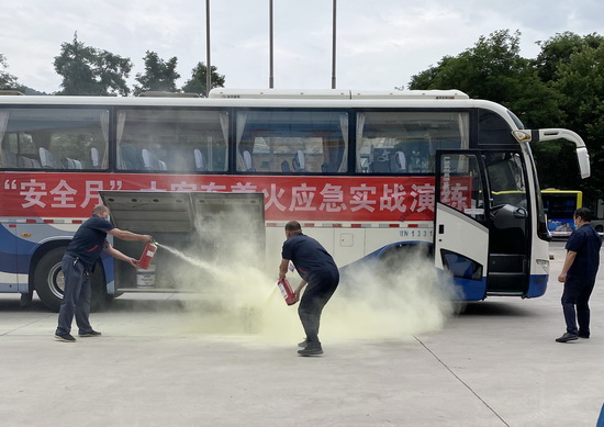 在演練時,隨著滿載乘客的大客車行駛至劉電賓館門前,突然行李艙起火,大客車駕駛員在突然遇火險緊急情況下,立即開啟應急雙閃燈,靠邊停車,打開車門,迅速引導車內乘客有序疏散,并要求大家用濕毛巾捂住口鼻,彎腰依次撤離到車外安全地帶。緊接著滅火組演練人員迅速行動起來,熟練地取出車載滅火器,拔下滅火器安全銷,用噴口對準火源根部,及時將火撲滅,救護組及時疏散和救援下車人員,并對傷員身體狀況進行基本護理和檢查。整個演練過程既緊張,又有條不紊,進一步增強了全體員工的安全意識,真正掌握了交通工具突發(fā)火險后迅速逃生、自救、互救的基本方法,達到了演練的預期目的。