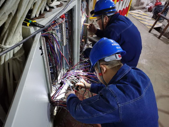 搶修期間,新盤柜的安裝配線給大家不小的挑戰(zhàn)。因受電纜長度限制和新盤柜內(nèi)設(shè)備布置不相同的影響,在電纜與盤柜控制端子、動力400伏接線排尺寸不夠的情況下,致使設(shè)備無法安裝。搶修人員群策群力,跨專業(yè)進(jìn)行分析討論,想出了辦法解決現(xiàn)場問題,例如:利用舊盤柜的銅牌做延伸接線排,拆除舊盤柜的支撐絕緣子,再自己動手制作絕緣子支撐使得延長銅排能懸掛,將新盤柜的進(jìn)線方式從下進(jìn)線改成上進(jìn)線,對盤柜重新開進(jìn)線孔,對新進(jìn)線孔拋光打磨做防護,甚至對接線方式改動同時對圖紙也進(jìn)行重新繪制,這都無形地增加了很多工作量,大家加班至凌晨已經(jīng)是一種常態(tài),但是在第二天早上8點所有的檢修施工人員會依然整齊列隊站在廠房門口召開班前會,安排部署當(dāng)天的工作,隨后又會投入到新一天緊張的搶修決戰(zhàn)之中。