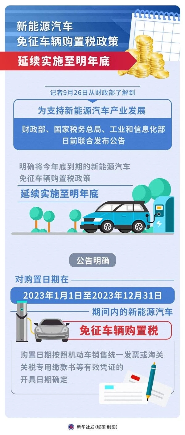 新華社北京9月26日電(記者申鋮)記者26日從財(cái)政部了解到,為支持新能源汽車(chē)產(chǎn)業(yè)發(fā)展,財(cái)政部、國(guó)家稅務(wù)總局、工業(yè)和信息化部日前聯(lián)合發(fā)布公告,明確將今年底到期的新能源汽車(chē)免征車(chē)輛購(gòu)置稅政策,延續(xù)實(shí)施至明年底。